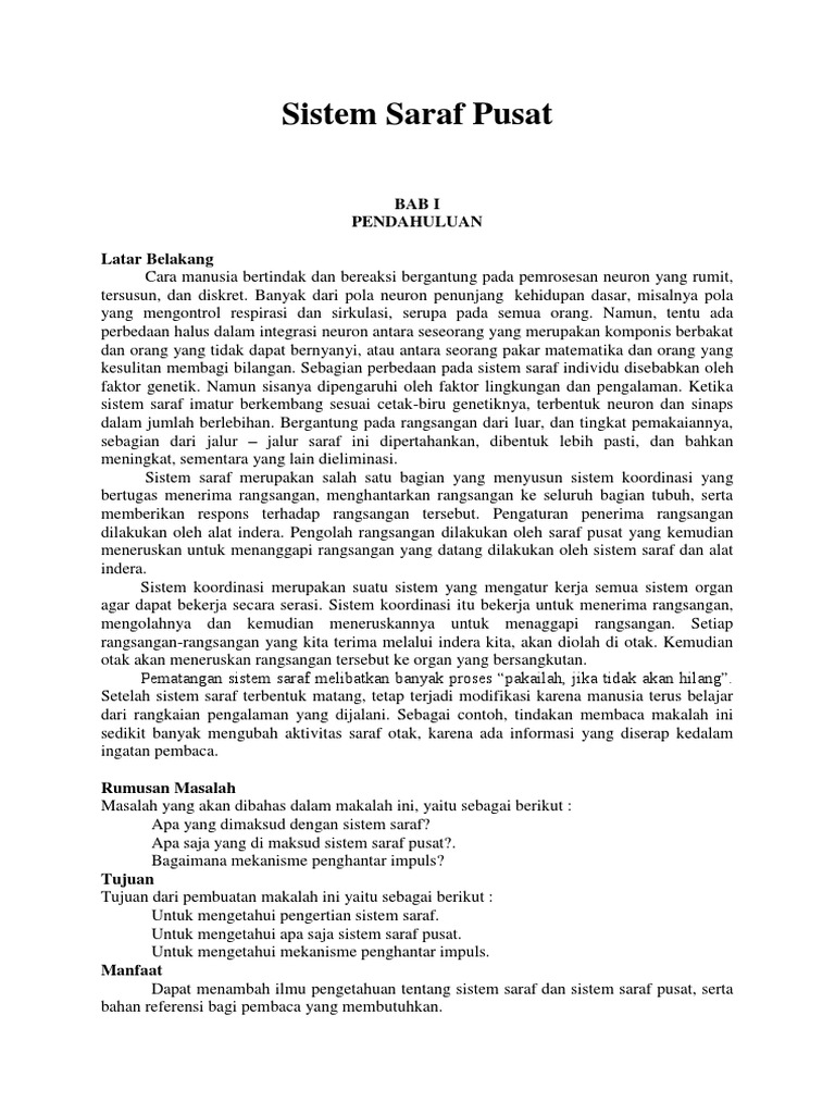 Makalah Sistem Saraf from imgv2-1-f.scribdassets.com Jun 25, 2021 · hewan triploblastik selomata, tubuh simetri bilateral bersegmen, memiliki otot, system pencernaan lengkap, system sirkulasi, system saraf tangga tali yaitu sistem saraf yang terdiri dari ganglia otak di depan tubuh dekat dengan faring dan tali saraf yang menembus segmen tubuh serta memiliki system ekskresi. A) memakan makanan yang bernutrisi b) berolahraga yang teratur c) senantiasa gembira dan bijak dalam menghadapi tekanan 3.2 saran supaya makalah ini dapat memberikan manfaat yang besar bagi pembaca, maka penulis menyarankan : Jul 02, 2021 · sistem saraf simpatik diaktifkan terutama dalam kondisi stres. Jun 29, 2021 · sistem saraf juga bertanggung jawab sebagai sistem persepsi, perilaku dan daya ingat, serta merangsang pergerakan tubuh (farley et al.,2014).kemampuan untuk dapat memahami, mempelajari, dan merespon suatu rangsangan merupakan hasil kerja terintegrasi sistem persarafan yang mencapai puncaknya dalam bentuk kepribadian dan tingkah laku individu (batticaca, 2008). Metode yang dikembangkan berdasarkan sistem saraf biologi ini, merupakan suatu langkah maju dalam industri komputer. Sejumlah literatur menganggap bahwa konsep jaringan saraf tiruan bermula pada makalah waffen mcculloch dan walter pitts pada tahun 1943. Sistem endomembran mencakup selubung nukleus, retikulum endoplasma, badan golgi, lisosom, berbagai jenis vakuola, dan membran plasma. Entdecke rezepte, einrichtungsideen, stilinterpretationen und andere ideen zum ausprobieren.